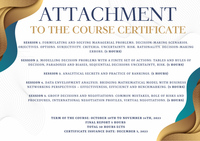 Курс лекцій базувався на керованому вивченні того, як визначати перешкоди в процесі прийняття бізнес-рішень. Під час курсу зроблено акценти на оцінці різних форм прийняття рішень у бізнесі та різних методів подолання бар’єрів і вирішення практичних бар’єрів ефективності. Курс охопив актуальні питання впливу цифровізації та бізнес-процеси та роль моделей комп’ютерної підтримки й мереж у прогресивних методах прийняття рішень.