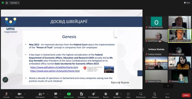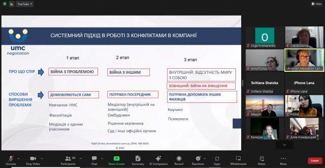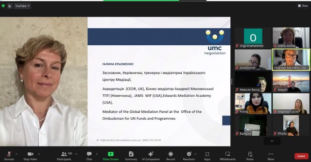 Захід провела Галина Єрьоменко, СЕО Українського Центру Медіації. Вона поділилась своїми знаннями та досвідом з актуальних питань, таких як: