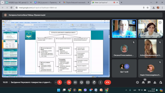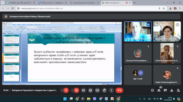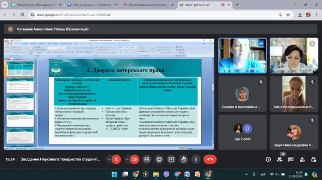 21.03.2024 р. на засіданні Наукового товариства студентів, аспірантів і молодих вчених Факультету економіки та управління доктор наук з державного управління, доцент, заступник декана з наукової роботи ФЕУ Рябець Катерина Анатоліївна провела науково-практичний семінар на тему: «Особливості реалізації норма авторського права». Були підняті такі питання, як: поняття, джерела та принципи авторського права; об’єктно-суб’єктна складова авторського права; строк чинності авторського права; захист авторського права і суміжних прав.