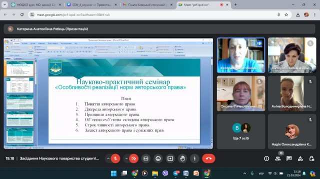 Заступник декана з наукової роботи ФЕУ, доктор наук з державного управління, доцент К.А. Рябець провела науково-практичний семінар на тему: «Особливості реалізації норма авторського права». Були підняті такі питання, як: поняття, джерела та принципи авторського права; об’єктно-суб’єктна складова авторського права; строк чинності авторського права; захист авторського права і суміжних прав.