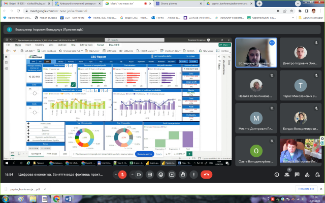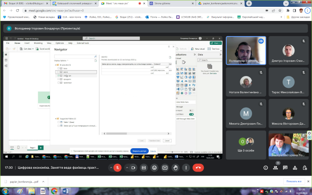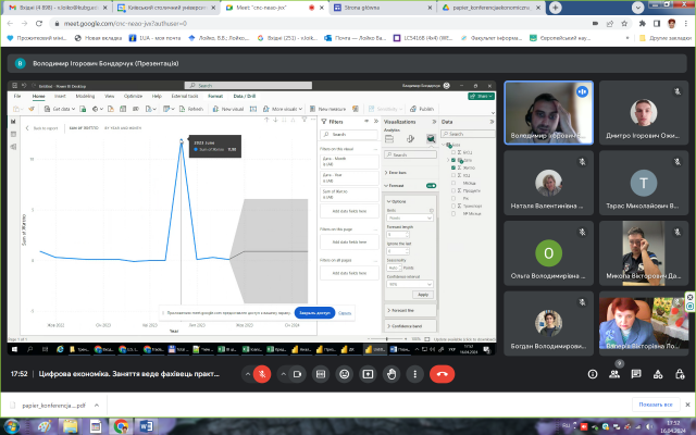 16 квітня 2024 р. відбулись практичні заняття з аспірантами з вибіркової навчальної дисципліни «Цифрова економіка та інновації», які провів управляючий партнер та фінансовий проектний менеджер американської компанії «СемантікВелл» Лімітед Ліабіліті Компані, здобувач освіти ступеня магістр ОПП «Міжнародна економіка» Бондарчук Володимир Ігорович. На заняттях Володимир Ігорович знайомив аспірантів з можливостями аналітичної роботи зі статистичними даними та базами даних за допомогою системи Power BI. Володимир Ігорович ознайомив аспірантів зі структурою аналітичної системи Power BI, розповів у якій формі повинні бути представлені статистичні дані для аналізу, показав графоаналітичні