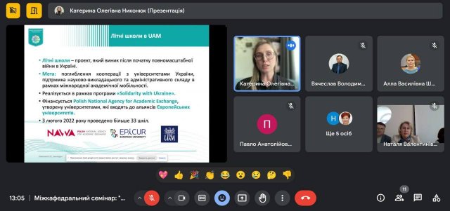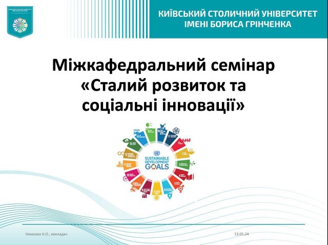 09.05.2024 року о 13:00 відбувся міжкафедральний семінар на тему "Сталий розвиток та соціальні інновації" за результатами участі викладача кафедри міжнародної економіки Факультету економіки та управління Київського столичного університету імені Бориса Грінченка Никонюк Катерини Олегівни в Міжнародній весняній школі в рамках проєкту "AMU Summer Schools 2.0" (21-27.04.2024), організованої Університетом імені Адама Міцкевича, Познань.