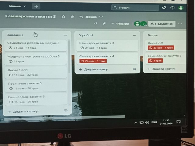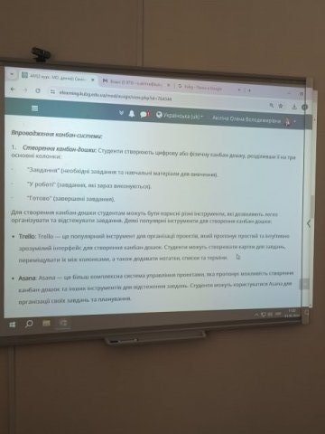 Одним із ключових аспектів цього заняття стало вивчення та практичне застосування системи канбан. Студенти, працюючи над кейсом, що стосувався застосування системи канбан у контексті опанування курсу з адміністративного менеджменту, навчилися створювати канбан-дошки, візуалізувати робочі процеси, ідентифікувати та усувати марнування, а також оптимізувати потік завдань.