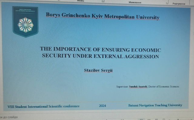 У рамках реалізації налагодженого партнерства між Київським столичним університетом імені Бориса Грінченка та Батумським навчальним інститутом навігації (Грузія) магістрант 1 курсу спеціальності «Економіка» ОП «Міжнародна економіка» Стазілов Сергій прийняв участь в роботі VIII Міжнародної наукової конференції студентів (м. Батумі, 23 червня 2024 р.).
