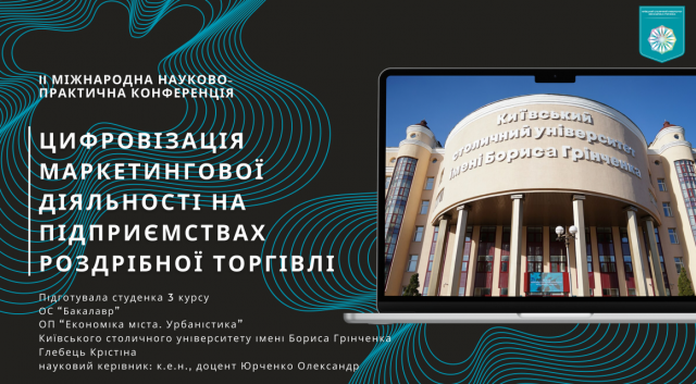 Крістіна представлена свою наукову доповідь на тему: Цифровізація маркетингової діяльності на підприємствах роздрібної торгівлі, розкривши проблемні питання омніканального та фіджитального маркетингу в умовах цифрового середовища.