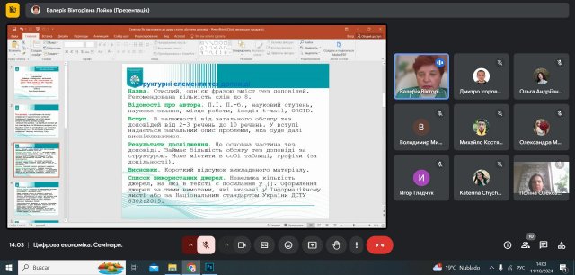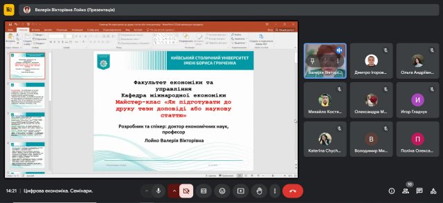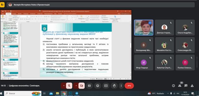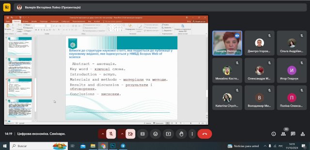 Професор кафедри міжнародної економіки Валерія Вікторівна Лойко, доктор економічних наук, зробила доповідь, в якій розповіла про основні відмінності у підготовці до друку тексту тез доповідей та тексту наукової статті. Зробила акцент на особливостях при підготовці до друку текстів наукових статей, які подаються до друку у наукове фахове видання та наукове видання, яке індексуються у НМБД Scopus, Web of science. Продемонструвала на прикладі власних статей прикладиоформлення та обсяги текстів статей, якінадруковані у фахових виданнях та у виданнях, що проіндексовані у НМБД Scopus, Web of science. Здобувачі освіти прийняли участь в обговоренні доповіді.