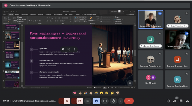 - Проблеми та виклики трудової дисципліни: учасники обговорили найбільш поширені проблеми, що виникають у сфері дотримання трудової дисципліни, зокрема, вплив зовнішніх факторів, внутрішньої мотивації та способів їх подолання.
