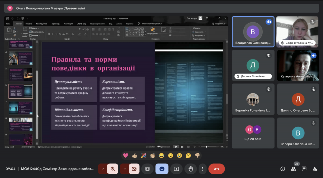 Учасники заняття були поділені на кілька мікрогруп, що сприяло інтерактивній формі навчання. Кожна мікрогрупа обрала конкретні аспекти трудової дисципліни та підготувала презентацію. Студенти мали можливість дослідити різні теми, які стосуються дисципліни на робочому місці, серед яких: