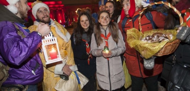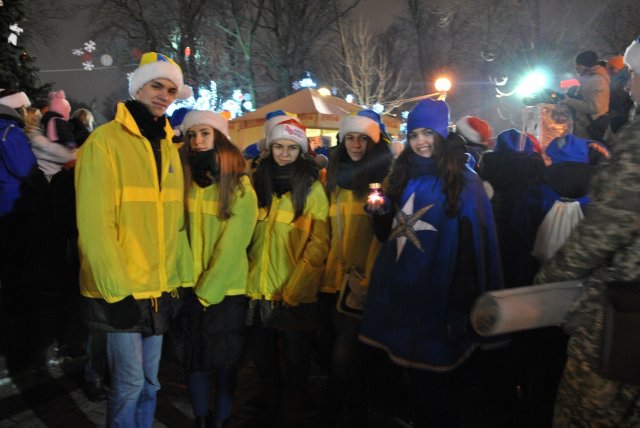 Перед початком ходи представники районних адміністрацій столиці отримали частинку Вифлеємського вогню, який потім від волонтерів міг отримати кожен бажаючий.