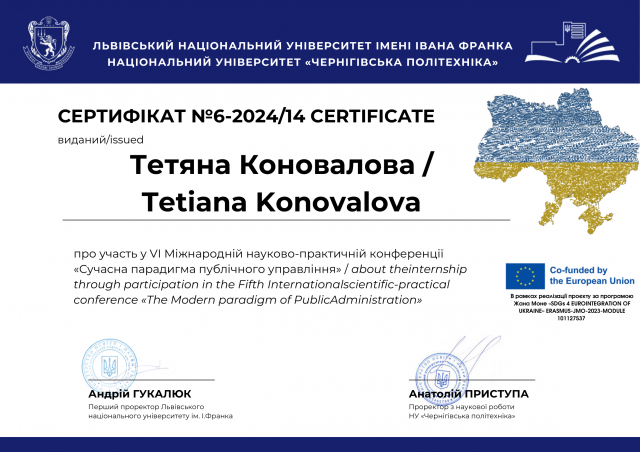 Студентка групи ДУм-1-23-1.4з спеціальності «Публічне управління та адміністрування» Коновалова Т.Г. під керівництвом професора кафедри управління Рябець К.А. взяла участь у VІ Міжнародній науково-практичній конференції «Сучасна парадигма публічного управління», що відбулася 14-16 листопада 2024 року. Захід проходив у рамках проєкту за програмою Жана Моне «SDGs 4 EUROINTEGRATION OF UKRAINE» (ERASMUS-JMO-2023-MODULE 101127537). Студентка презентувала результати свого дослідження, які були опубліковані в електронному збірнику конференції, та отримала сертифікат.