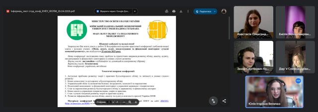 27 березня 2025 р. відбулося засідання Наукового товариства студентів, аспірантів та молодих вчених Факультету економіки та управління. Голова НТ Величко Ю.І. презентувала анонс наукових заходів, запланованих на квітень 2025 р., та запросила членів Наукового товариства взяти участь у них. Особливу увагу було приділено вимогам дотримання академічної доброчесності. Принагідно обговорили лекцію на тему «Імперативи академічної доброчесності в системі забезпечення якості вищої освіти», яку 24 березня 2025 р. провела професор кафедри управління Шульга О.А. Студенти мали можливість дізнатися про особливості науково-дослідної роботи, сутність академічної доброчесності та її імперативів, види порушень академічної доброчесності, а також відповідальність за порушення академічної доброчесності для здобувачів вищої освіти