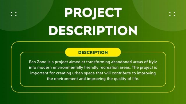 «ECO ZONE» - проєкт, спрямований на перетворення занедбаних районів Києва на сучасні екологічно чисті зони відпочинку. Проєкт важливий для створення міського простору, який сприятиме збереженню довкілля та покращенню якості життя.