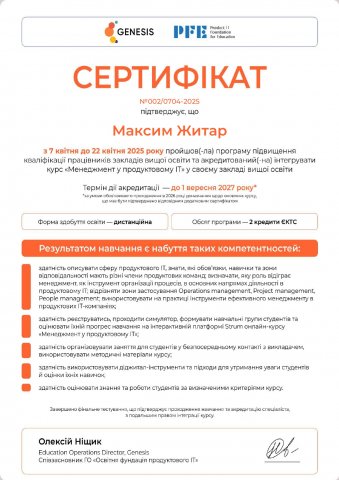 У квітні 2025 року професор кафедри фінансів Максим Житар успішно завершив курс «Менеджмент у продуктовому ІТ» на освітній платформі Strum Education. Програма була сфокусована на розумінні ключових елементів управління в продуктових компаніях - project management, operations management та people management - у сучасному цифровому середовищі.