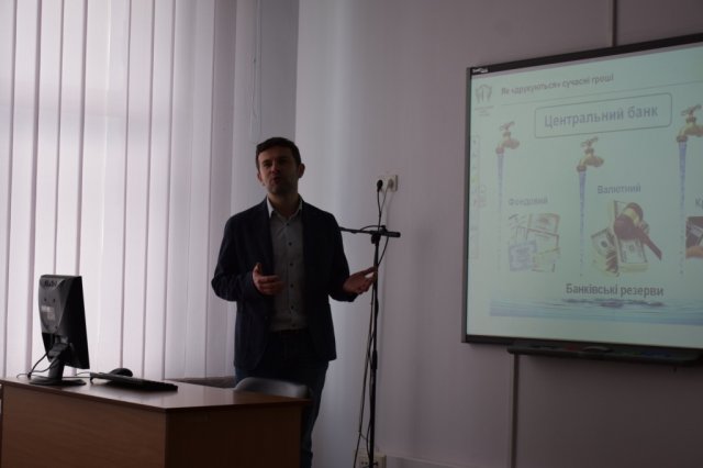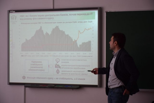 Під час лекції представник центробанку розповів студентам про сучасну монетарну політику НБУ, яка базується на основі режиму інфляційного таргетування (ІТ). Саме цей режим монетарної політики дозволив багатьом успішним на сьогодні країнам подолати високу інфляцію та закласти міцний фундамент для економічного зростання.