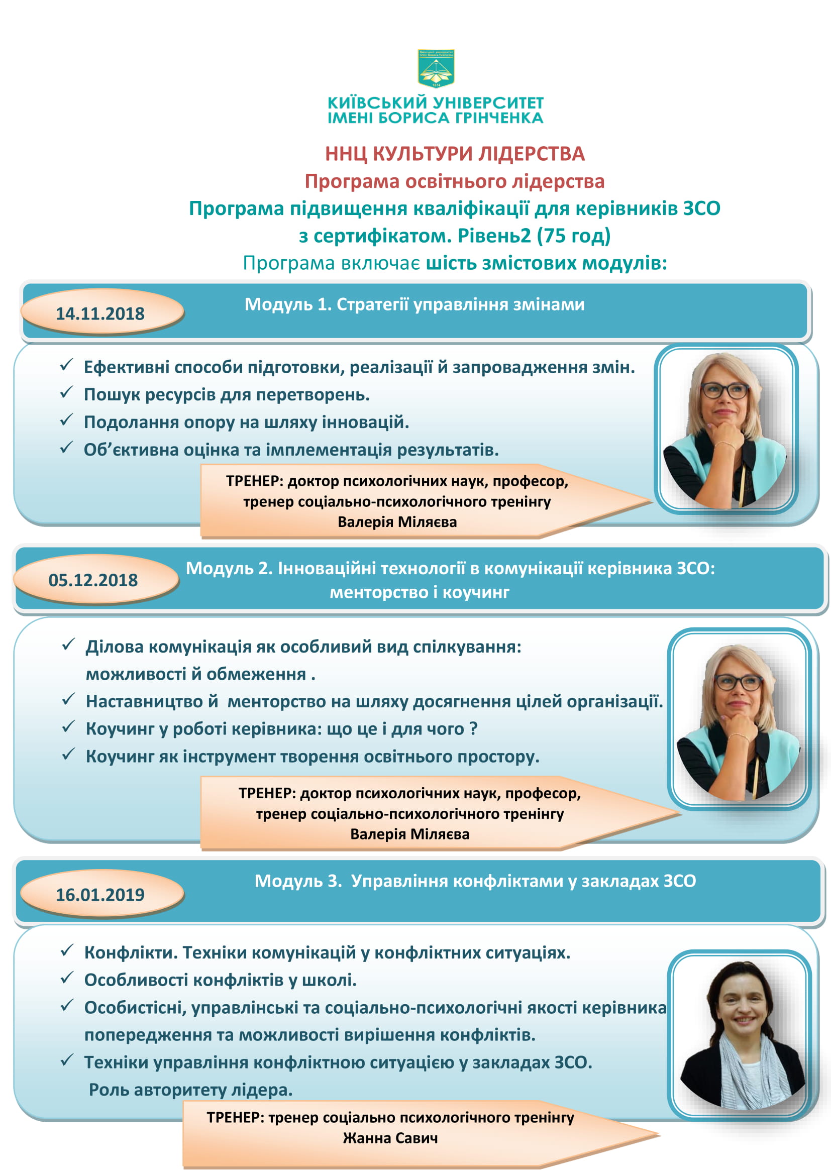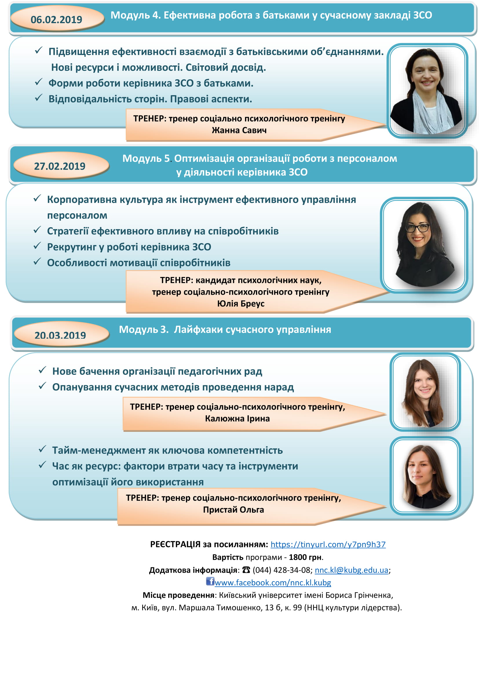 Після проходження УСІХ ШЕСТИ МОДУЛІВ кожен учасник отримує сертифікат. Вартість програми - 1800 грн. Запрошуємо Вас зареєструватися за посиланням : https://tinyurl.com/y7pn9h37 Місце проведення: Київський університет імені Бориса Грінченка, м. Київ, вул. Маршала Тимошенка, 13б, ауд. 99 (ННЦ культури лідерства)