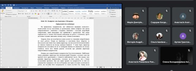 28 листопада 2024 року на базі Центру розвитку Soft skills відбулося практикоорієнтоване заняття у форматі симуляції медіаційного процесу. Основою заняття став кейс про конфлікт між двома співробітниками приватного підприємства, яке надає психолого-педагогічні послуги, – Іванченком і Петренком. Суперечка виникла через затвердження одного зі співробітників на посаду стажиста, що спричинило напруження в колективі.